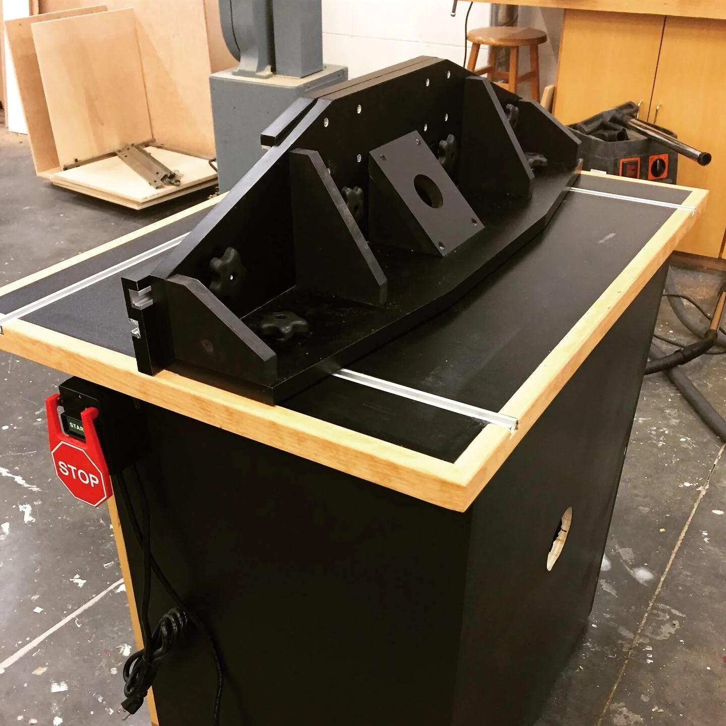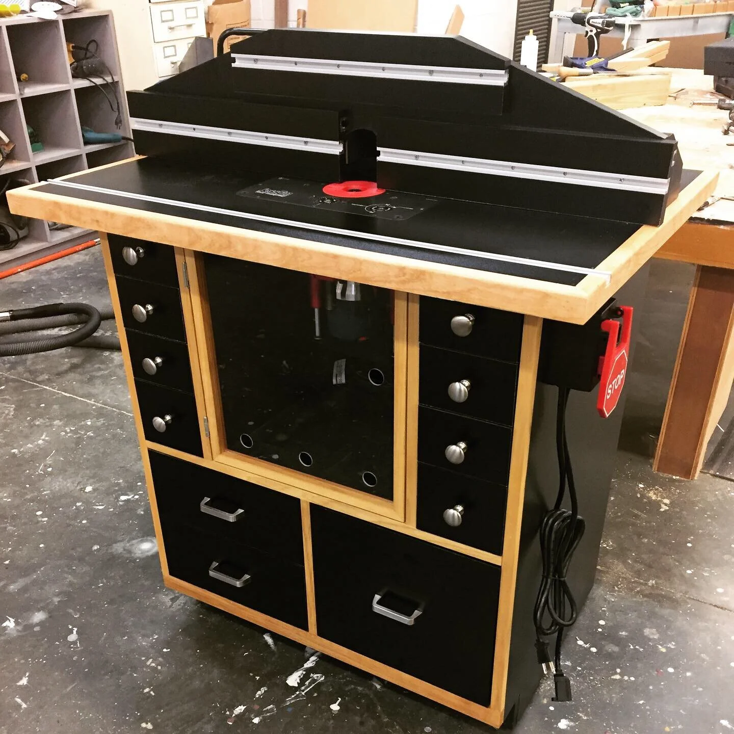 Router table with Jessem router lift, movable fence system, on/off paddle switch, and drawers for bit and accessory storage.