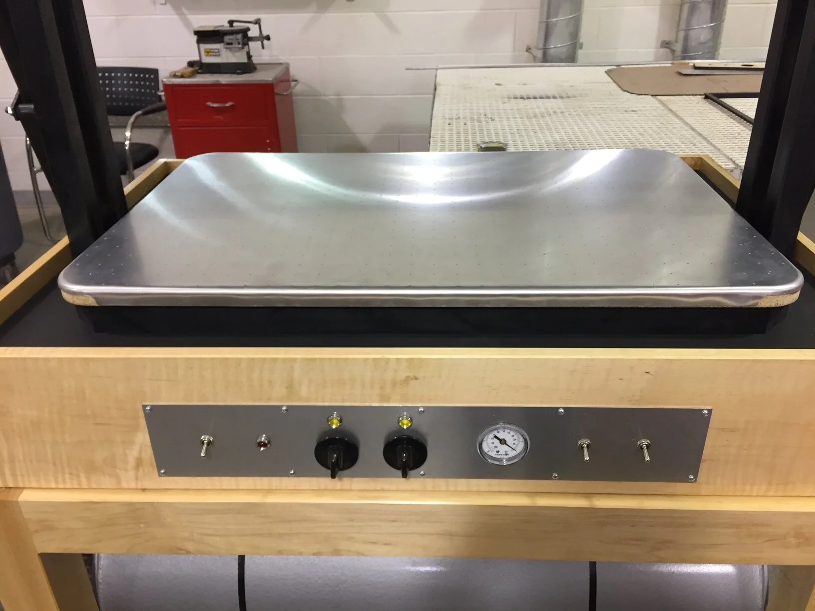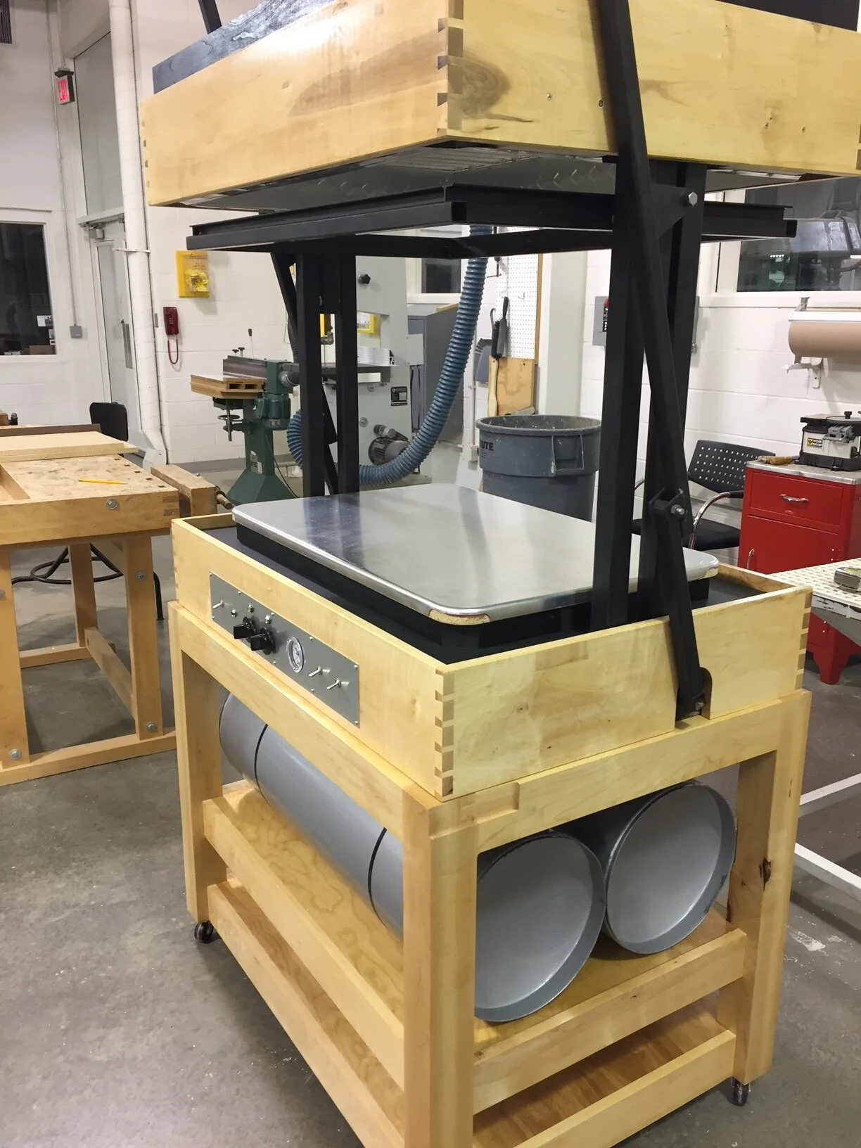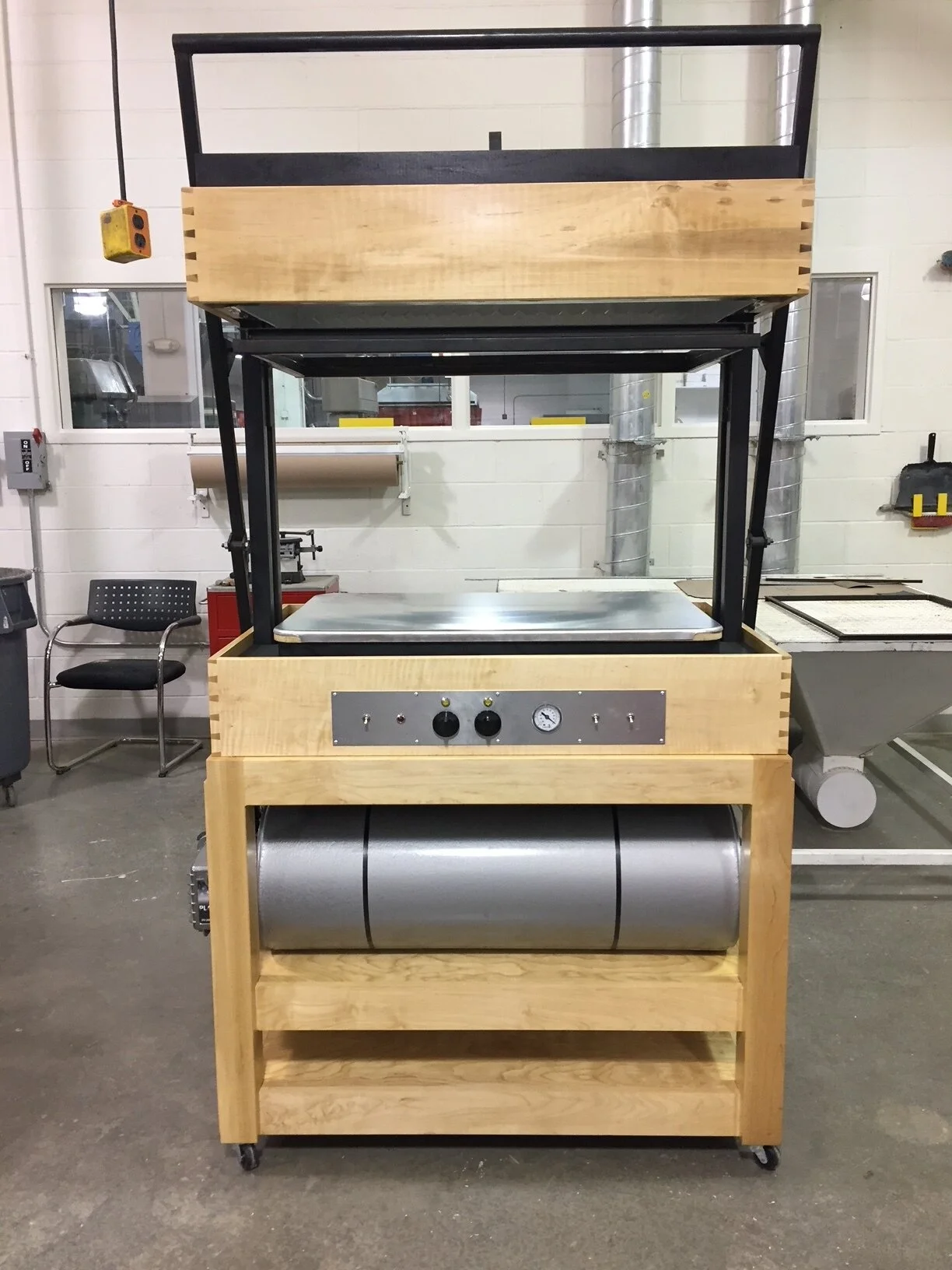 Vacuum forming machine built in collaboration with shop supervisor for SCAD. This machine was based off of Proto-Form plans, and features a 24” x 36” handmade platen, fabricated steel chassis, maple frame, and a high output multi-zoned oven.